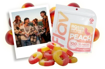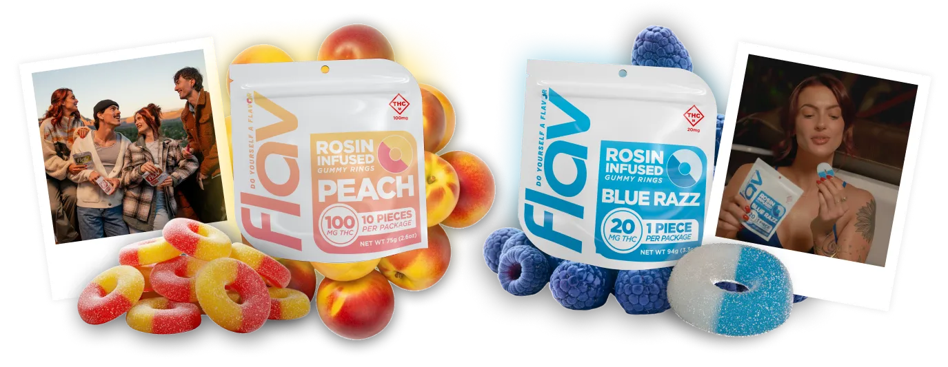 Available in seven sweet flavors, and Hash Rosin (MO Exclusive) and High Potency Distillate (NY and AZ), Flav rings provide an excellent adult snacking experience. With only the finest ingredients, our fruit flavored THC gummy rings provide controlled dosing with a fresh, delicious taste.